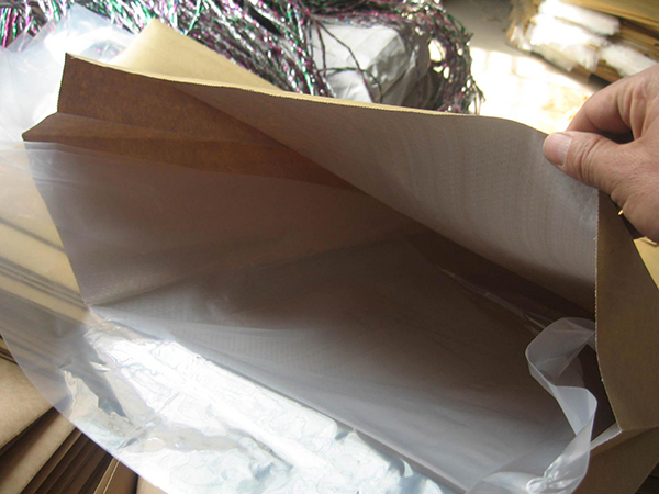 紙塑袋又稱三合一復合紙袋,是由塑膠與牛皮紙復合而成,通常塑膠層采用pp聚丙烯(pp)為基材的pp扃絲編織布,牛皮紙則采用精制復合專用牛皮紙,二者通過熔融塑料熱復膜粘合而成,牛皮紙淋膜布經制袋成型,再加工縫制成三合一紙塑袋。